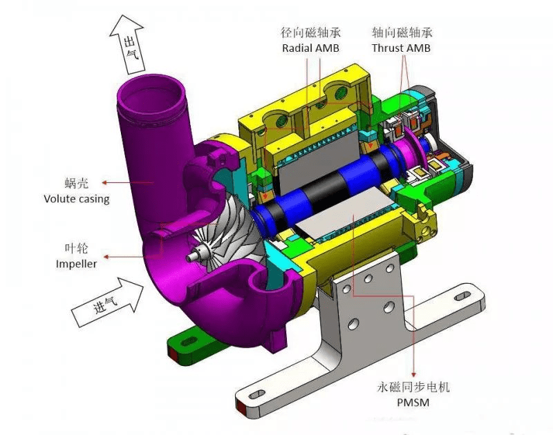 磁懸浮離心風(fēng)機(jī)是通過(guò)電磁或空氣的作用,使轉(zhuǎn)動(dòng)軸形成懸浮狀態(tài),摩擦阻力小,效率高,也可以通過(guò)進(jìn)口導(dǎo)葉調(diào)整風(fēng)量。懸浮離心風(fēng)機(jī)由于摩擦力小,風(fēng)機(jī)效率會(huì)更高。磁懸浮風(fēng)機(jī)葉輪也為單級(jí)高速類型,性能曲線與單級(jí)高速離心風(fēng)機(jī)類似?!「咚匐姍C(jī)直接驅(qū)動(dòng)三元流葉輪,省卻了齒輪箱,徹底消除機(jī)械傳動(dòng)損失,實(shí)現(xiàn)高轉(zhuǎn)速。