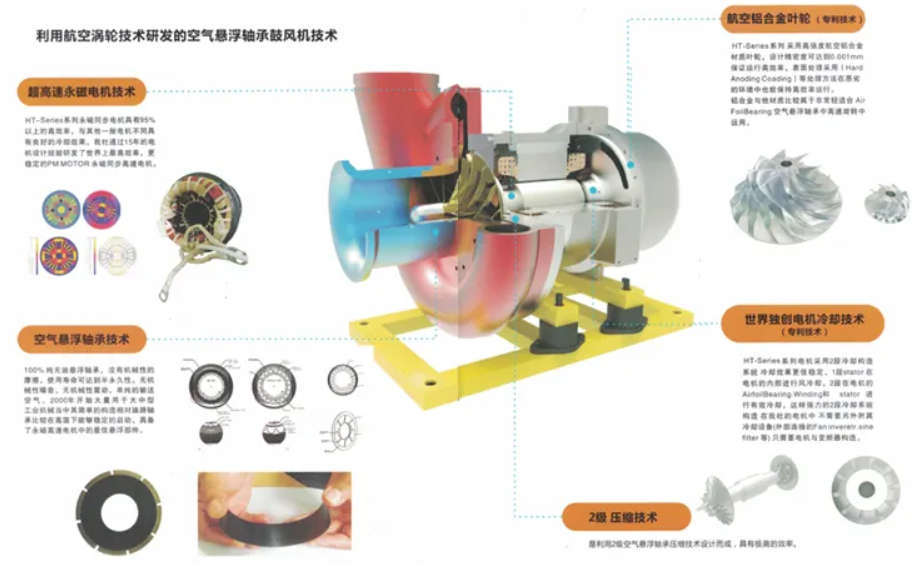 空氣懸浮離心鼓風(fēng)機(jī)是一種全新概念的離心鼓風(fēng)機(jī),借鑒航空、航天器的渦輪發(fā)動(dòng)機(jī),應(yīng)用先進(jìn)的空氣懸浮技術(shù),采用了“高效永磁電機(jī)”和“空氣懸浮軸承”這兩個(gè)高端核心技術(shù),改善了傳統(tǒng)單級(jí)高速渦輪鼓風(fēng)機(jī)的轉(zhuǎn)速齒輪、聯(lián)軸器、冷卻系統(tǒng)和油潤(rùn)滑系統(tǒng)等,大大提高了產(chǎn)品的技術(shù)性能及運(yùn)行可靠性。避免了噪音、振動(dòng)以及廢棄潤(rùn)滑油等對(duì)環(huán)境造成的二次污染,大大減少了設(shè)備維護(hù)工作量,節(jié)約了設(shè)備維護(hù)成本。
